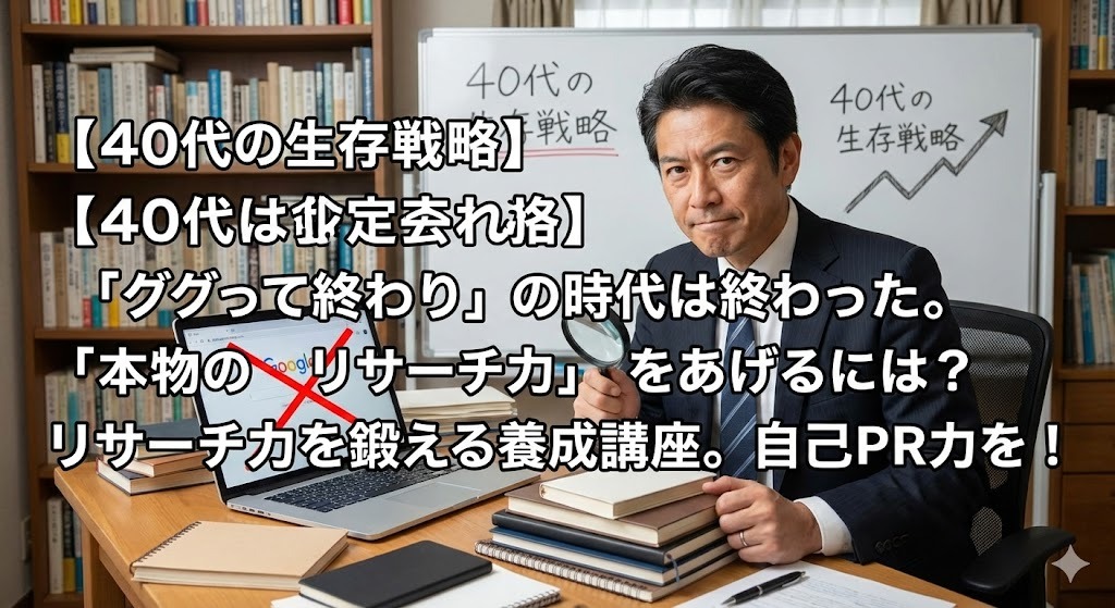 - 【40代の生存戦略】「ググって終わり」の時代は終わった。「本物のリサーチ力」をあげるには?リサーチ力を鍛える養成講座。自己PR力を!